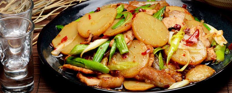 1、土豆去皮洗净,切片,放入水中洗去多余淀粉,五花肉切片,姜切丝,大蒜苗切段。