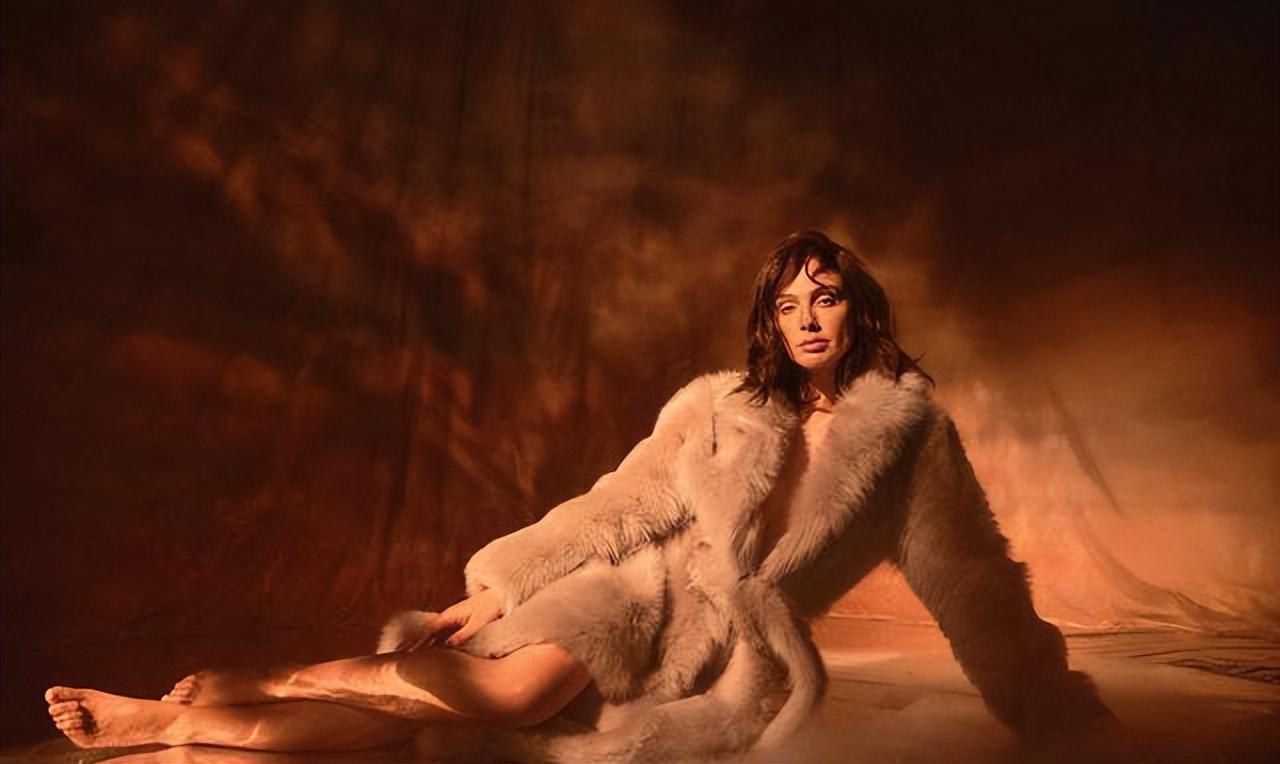 照片中的她,身穿灰色貂衣,侧身坐在地上,张力十足,大秀性感美腿。