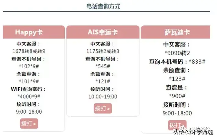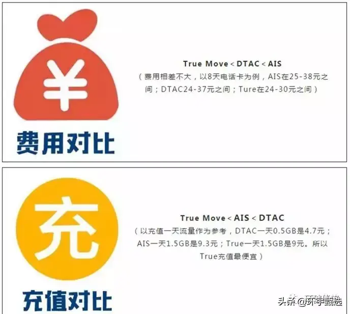 综合来说:DTAC的happy卡是流量最多,通话时间最长,性价比最高的。True Move的萨瓦迪卡是速度最快,信号最好的。AIS的幸运卡是牌子最硬,费用最高的,各方面比较均匀。推荐: