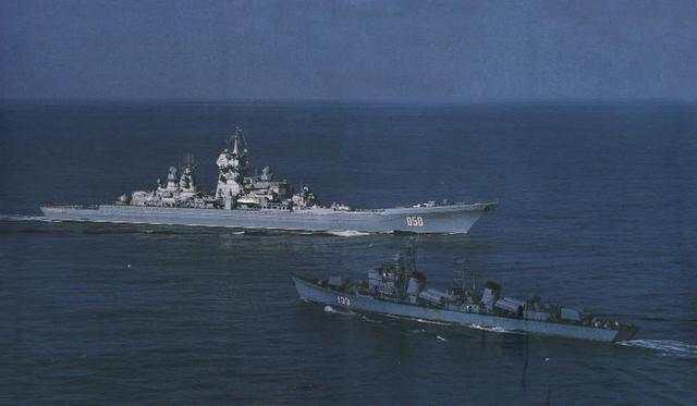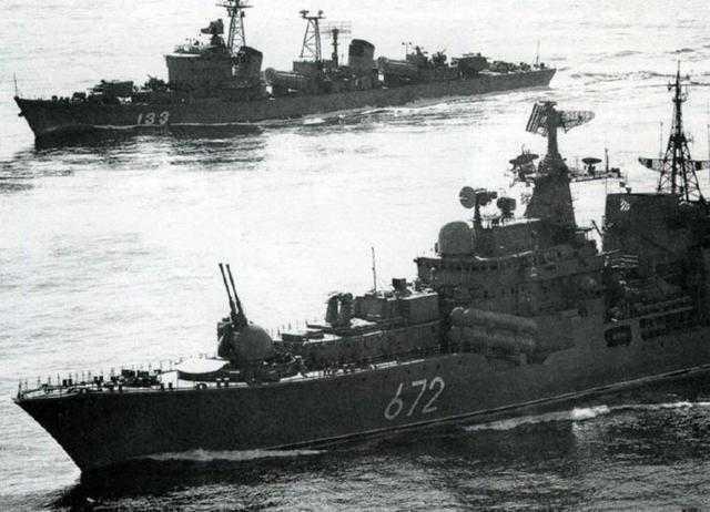 重庆号贴身监视同属伏龙芝号编队苏联海军慎密号导弹驱逐舰,缜密号主炮以最大角度上仰表示无敌意
