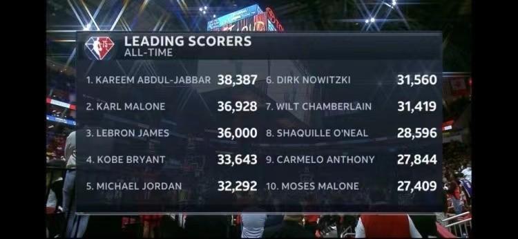 NBA历史得分榜单更新:詹姆斯第三,科比仅第四,那么榜首是谁?