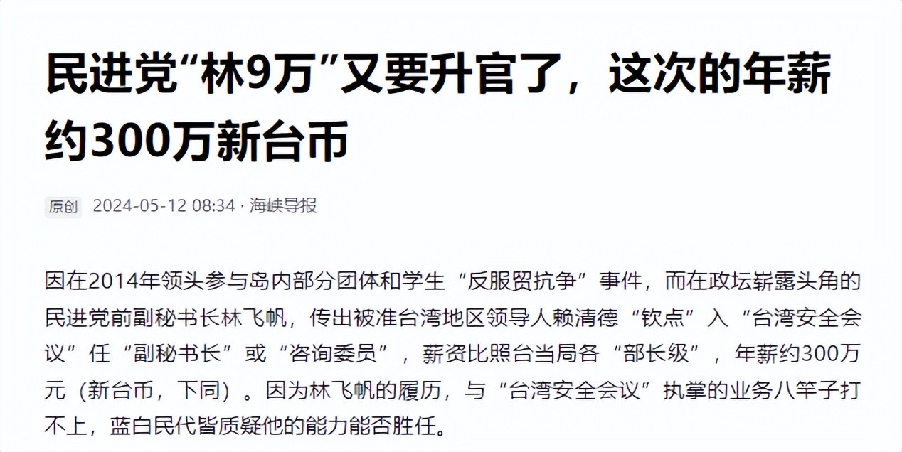 海峡导报2024年5月12日——《民进党“林9万”又要升官了,这次的年薪约300万新台币》