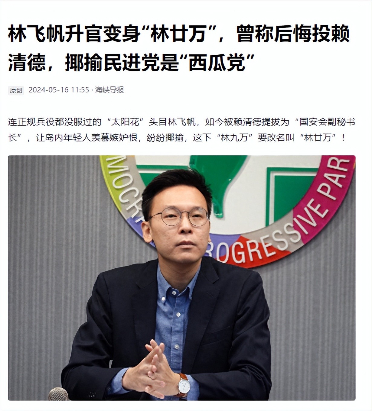 海峡导报2024年5月16日——《林飞帆升官变身“林廿万”,曾称后悔投赖清德,揶揄民进党是“西瓜党”》