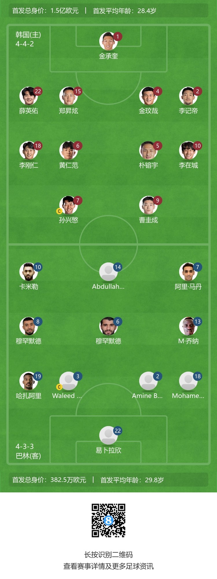 马宁执法!韩国vs巴林首发:孙兴慜、金玟哉先发,李刚仁出战