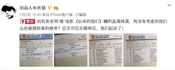 怎料2019年1月7日,“出品人布衣翁”宣布将《后来的我们》告上法庭,索赔7000万,他当时写道:刘若英老师“借”电影《后来的我们》赚的盆满钵满,有没有考虑到我们这些被侵权者的感受?忍无可忍无需再忍,我们起诉了!