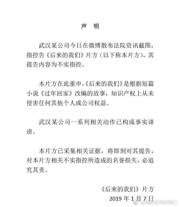 对于抄袭和不正当竞争,《后来的我们》发表声明否认,片方称,“《后来的我们》是根据短篇小说《过年回家》改编的故事,知识产权上从未侵害任何其他个人或公司权益。武汉某公司一系列相关动作已构成事实诽谤。本片方已采集相关证据,将即刻对其提告,对本片方相关不实指控所造成的名誉损失,必追究其责。”