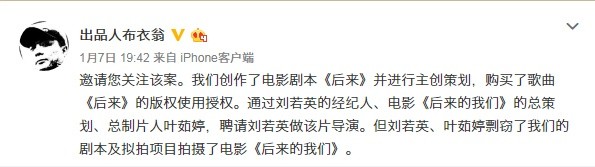 “出品人布衣翁”称,“我们创作了电影剧本《后来》并进行主创策划,购买了歌曲《后来》的版权使用授权。通过刘若英的经纪人、电影《后来的我们》的总策划、总制片人叶茹婷,聘请刘若英做该片导演。但刘若英、叶茹婷剽窃了我们的剧本及拟拍项目拍摄了电影《后来的我们》。”