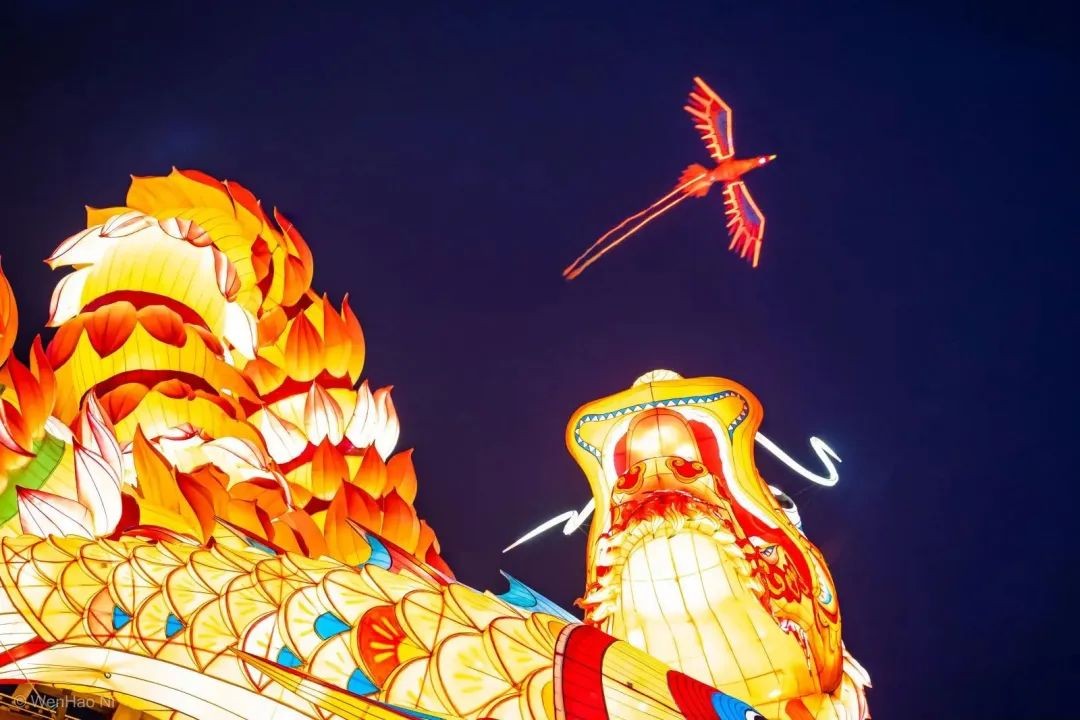 在主舞台上空,还有凤凰扑翼机表演,夜空中缓缓展翅,凌空飞舞,绚烂如画,舞台已就绪,只等你的到来!期待在自贡灯会,与大家相遇!
