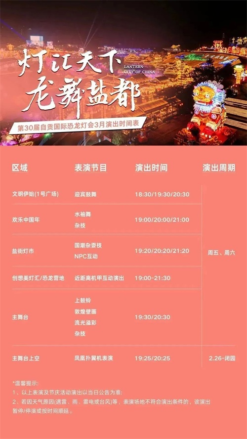 三月伊始,春色正好,自贡灯会活动持续升温,精彩不断上演,这份灯会演出攻略快来收藏,赏灯会,看演出,让你的三月欢乐无限,耍法不重样,趁着周末,快带着家人朋友来自贡灯会欢快的游玩吧!