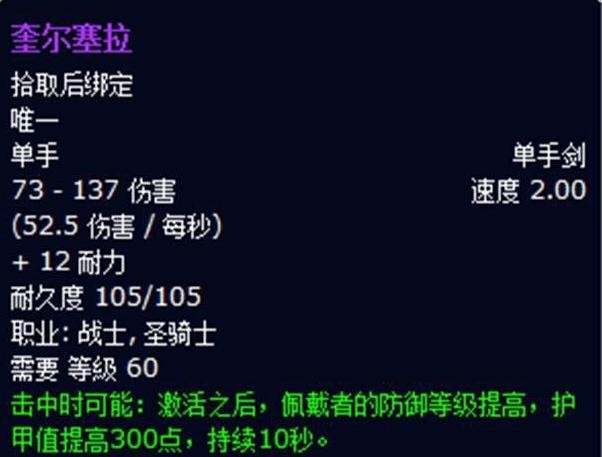 奎拉塞尔作为魔兽世界怀旧服最值得入手的一把单手武器,可以说是防骑、狂暴战、防战最爱的武器了,"击中时可能: 激活之后,佩戴者可以获得20点防御值和300点护甲值,持续10秒。"这绝对是下副本抗伤害的最佳buff了,而且这把史诗单手剑也非常的帅气,简直是下本和装b必选了。
