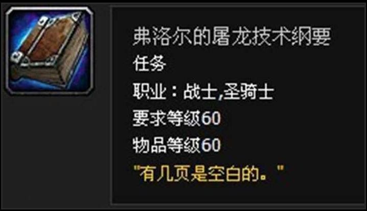 当然这个副本最出名的就是会掉落"弗洛尔的屠龙技术纲要",这是战士以及圣骑士职业通过史诗任务链获得史诗单手剑——奎拉塞尔的重要任务物品。