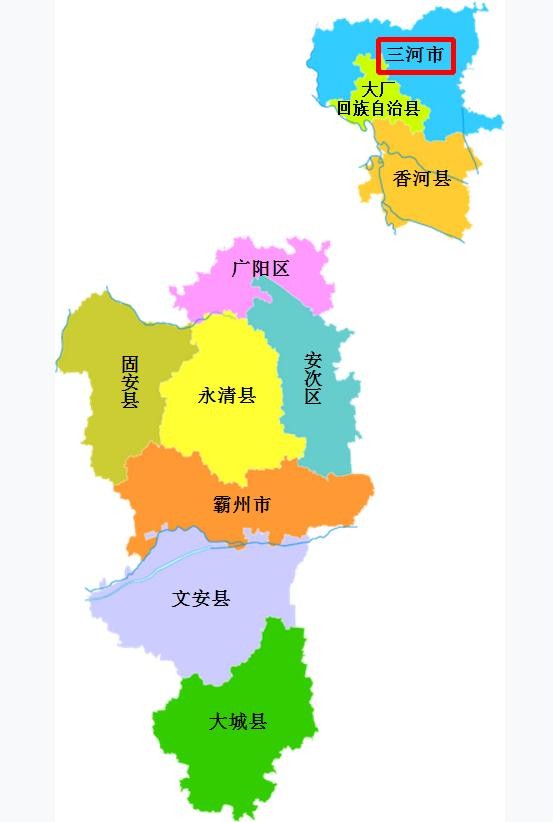 下面是河北省廊坊市的行政区划地图,可以看出三河市位于廊坊市最北面的地方。