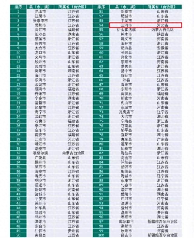 2019年根据全国百强县的排名,河北省廊坊市三河市位列第54位,也是河北省的第2位。三河市是一个位置非常特殊的县级市,它位于河北省廊坊市在京津之间的飞地里面。