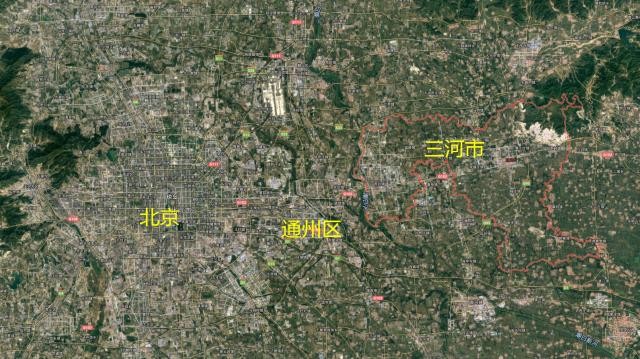 下面就是三河市与北京的关系,它们在一条东西向的通道上面,的确是联系紧密。