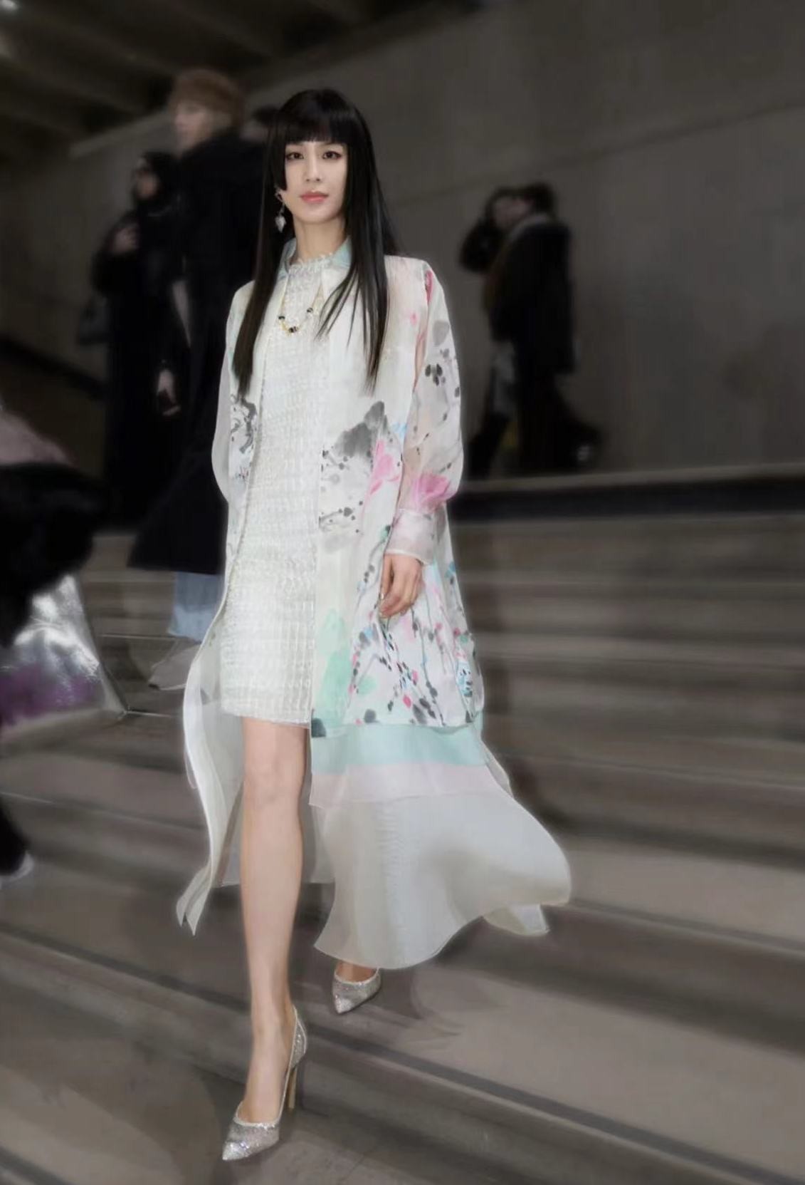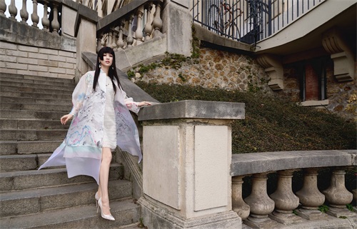 这是黄圣依在巴黎时装周的公主切打扮的写真。她身穿银色短裙,外面披肩中国风的水墨画的披风,发型是公主切的装扮,风格亦中亦西,很有特色的。
