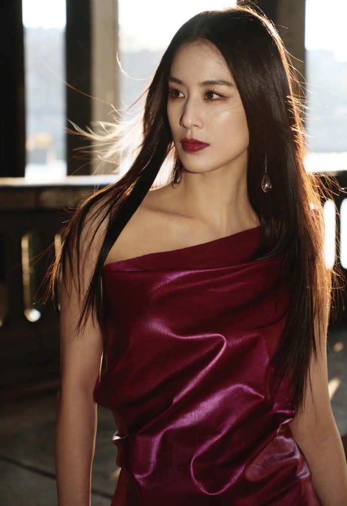 这是黄圣依在巴黎时装周上的红色斜肩高开衩长裙的写真。她头发飘逸,一副侠女飒爽英姿的气派。