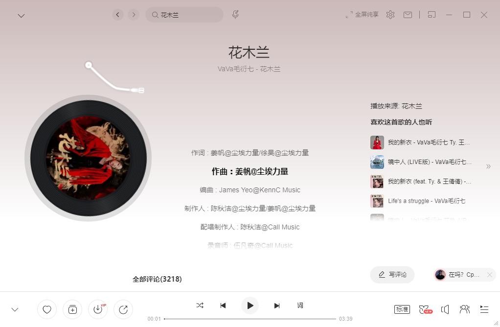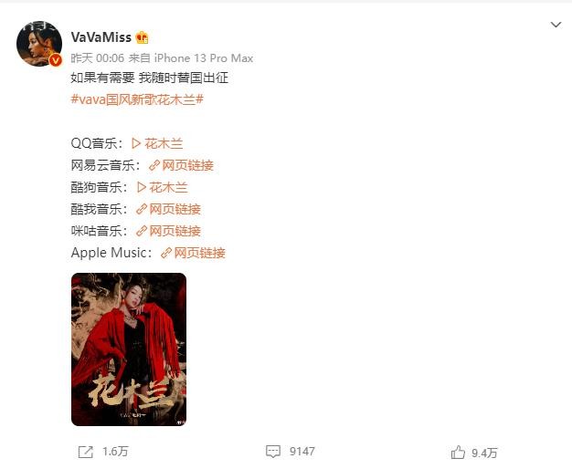VAVA在昨天发出新歌花木兰