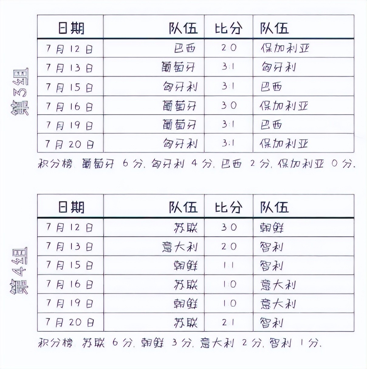 但更令人吃惊的事发生在第四小组。从来不为人所知的朝鲜队第一场以0:3输给苏联队,第二场1:1平智利。第三场对意大利,意队可能是想保存实力迎接四分之一决赛,所以竟将7名主力雪藏。没想到朝鲜队上半时结束前的一记入球使意队遭到意外失败,他们不得不提前回国,而在机场球迷为他们准备的是一筐烂西红柿。这一小组苏联队和朝鲜队出线。