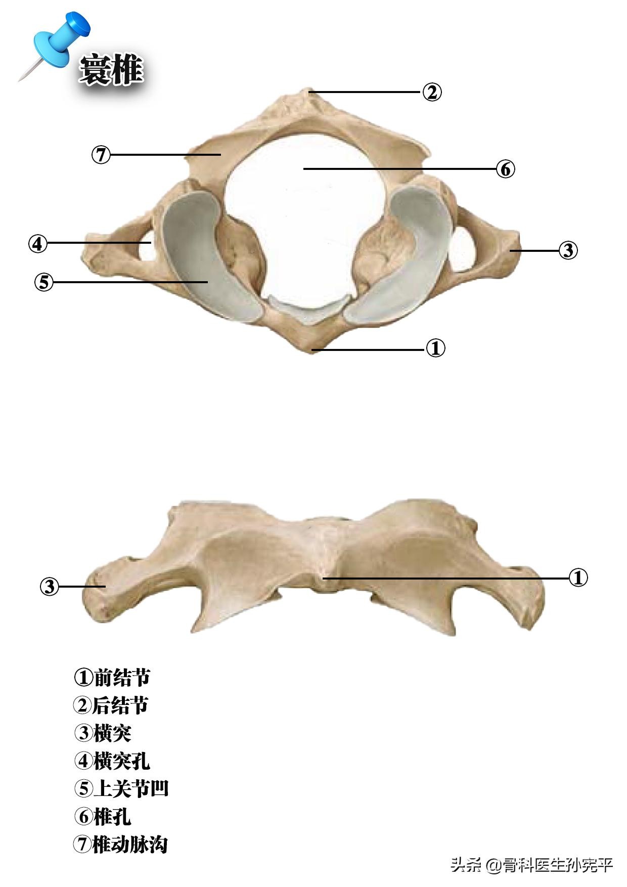 寰椎(C1):上方与枕骨髁形成寰枕关节,寰椎的特点是无椎体、无棘突、无椎弓根,呈环形,前方称为前弓、后方称为后弓,两侧为侧块。前弓中央前方有前结节,为颈长肌的附着点,后弓的中央为后结节。