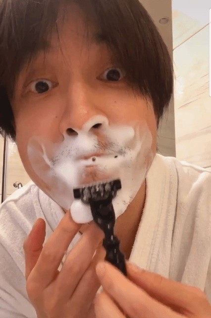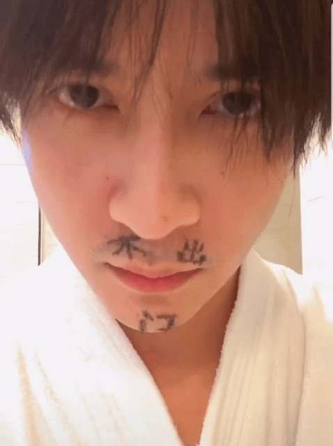 薛之谦之前还玩过自己的胡子,男人只要几天不刮胡子就长得飞快,薛之谦对着镜子自己刮胡子,抹上泡沫,用刮胡刀一点一点手动操作,最后还用上一把红色小修眉刀修剪,原来,薛之谦把自己的胡子刮出了三个汉字"不~出~门"!