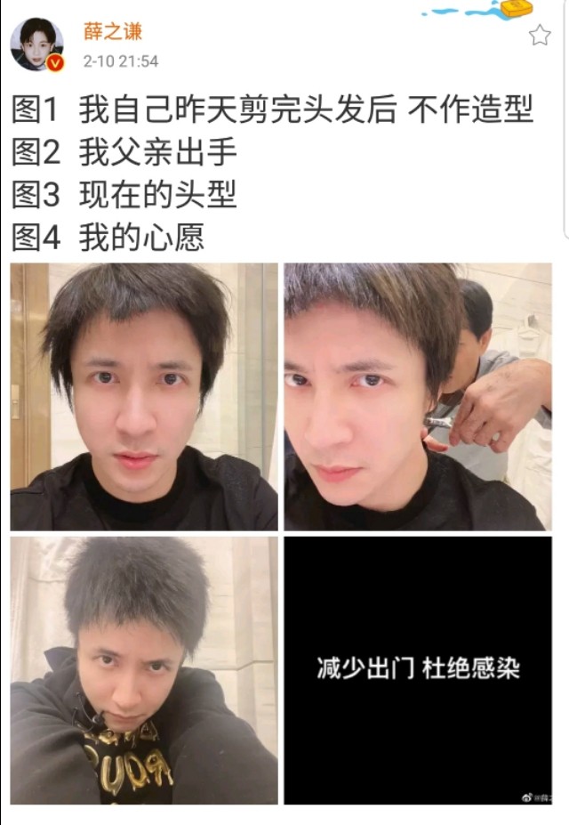 2月10日晚,薛之谦在个人社交平台分享了几张照片,原来因为疫情当前,不能出门理发,薛之谦不得已自己动手剪起头发。