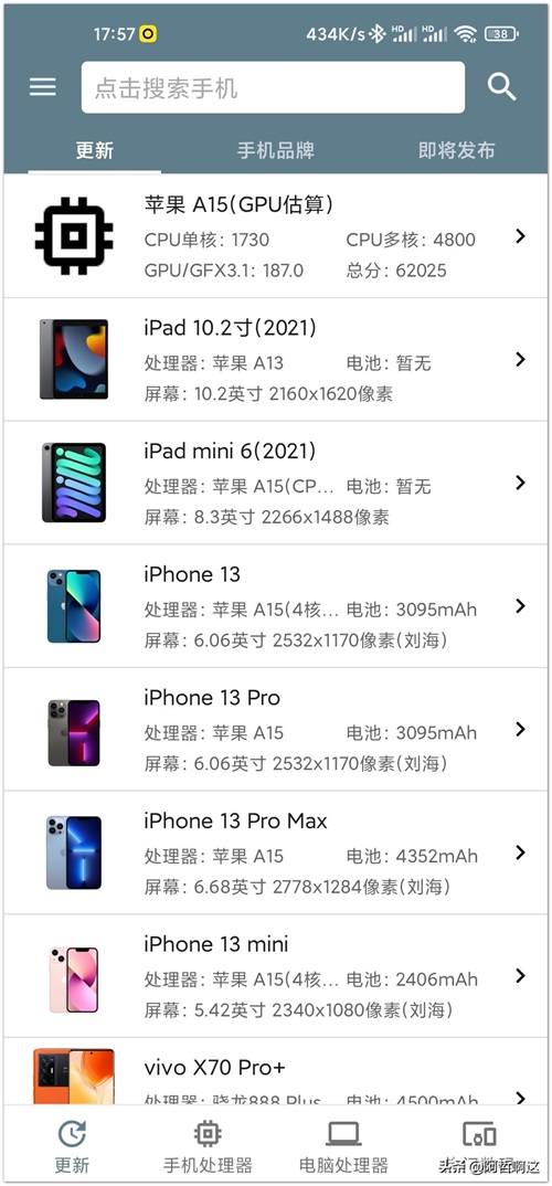 软件里的数码产品配置数据更新的速度很快,最新发布的手机、处理器以及各种电子产品,它都会第一时间更新!
