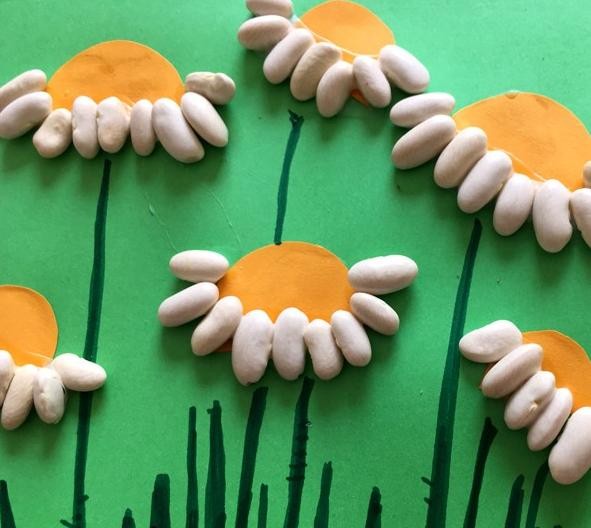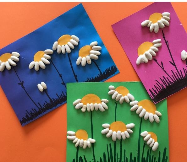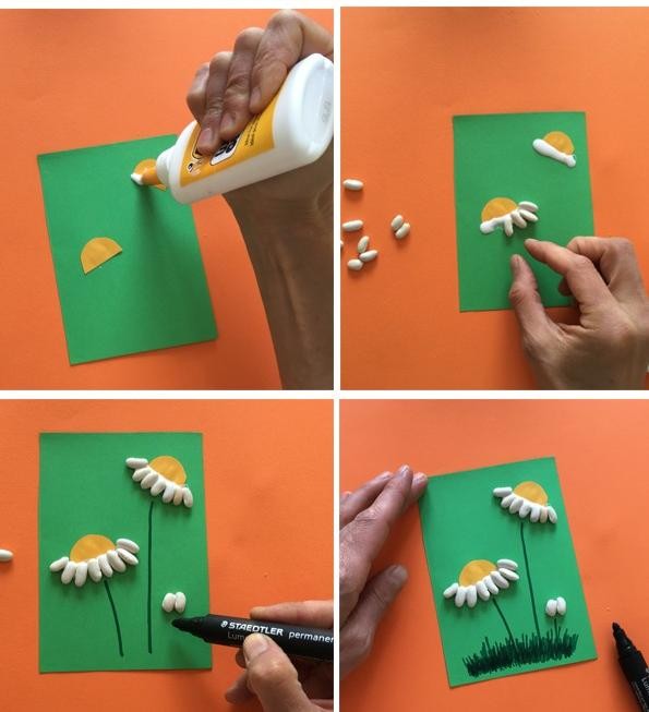 3、在半圆卡纸的横截面涂上胶水,将之前揉好的长条胶囊状的黏土粘贴在胶水处,最后画上雏菊的茎和叶。这样就完成啦!