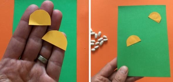 2、用剪刀将黄色卡纸修剪成两个半圆,按图所示的位置粘贴在卡纸上。
