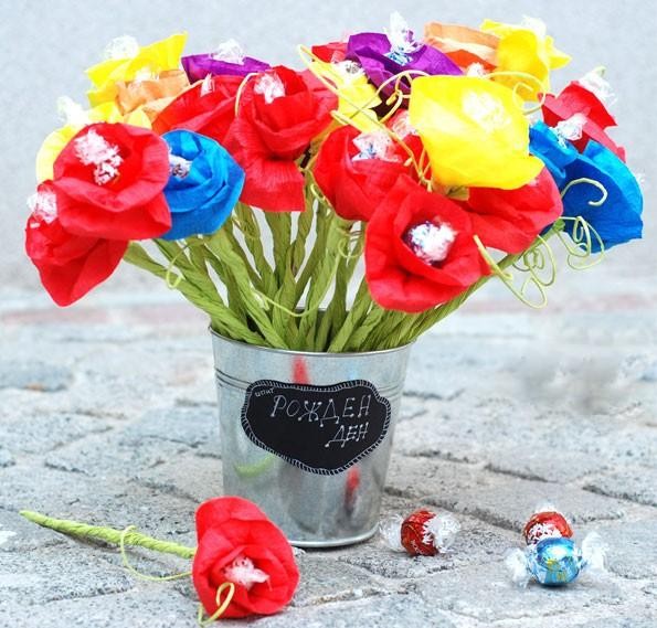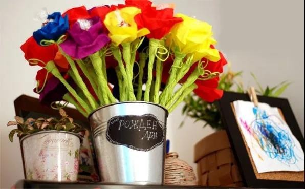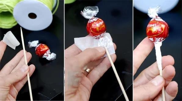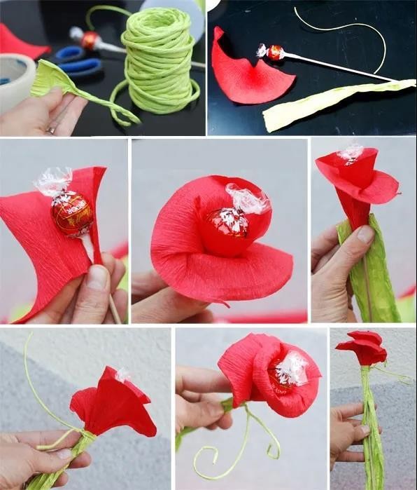 3、将已拉伸的皱纹纸的一端绕在糖果上,制作成一朵花;将展开的绿色纸绳(或用剪好的皱纹纸)缠绕在木棍上并拧紧。在顶部用线绳卷出好看的弧度。