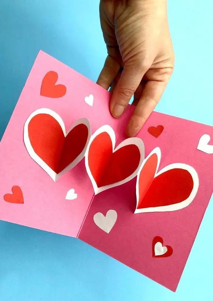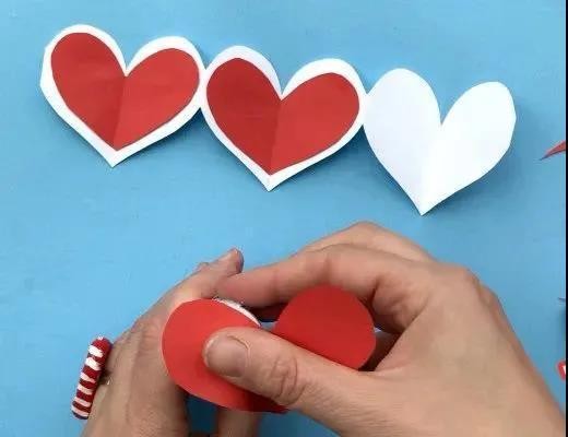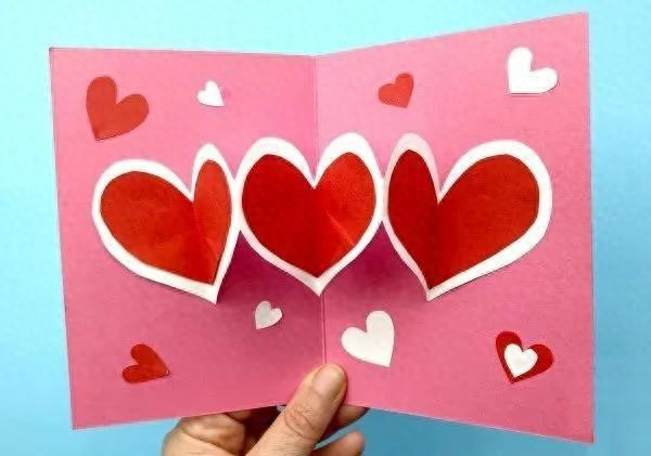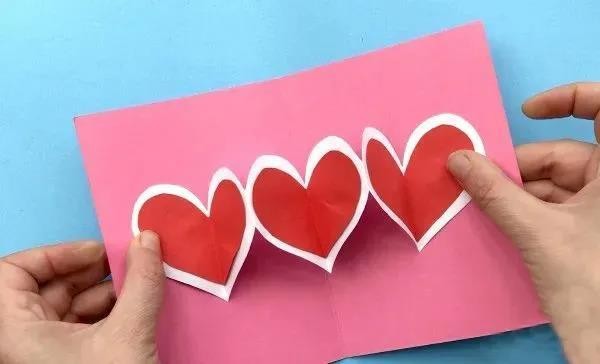6、再剪些小小的爱心装饰在卡片上,充满爱意的立体爱心弹出卡就做好了,简单不简单?