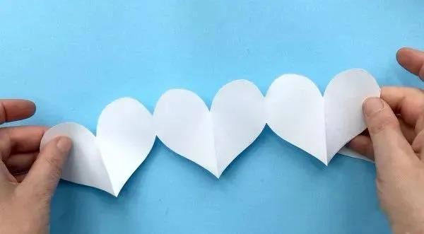 5、选择粉红色的卡纸对折,将这串爱心的两侧分别粘在卡纸两边。