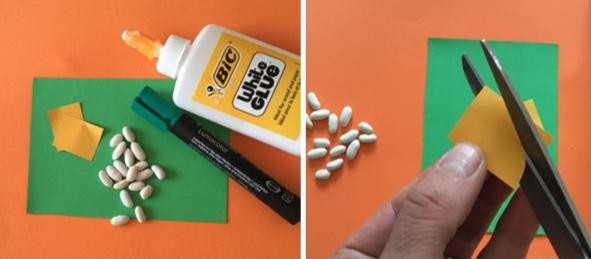 1、准备好一张自己喜欢颜色的卡纸作为背景底板、两小块黄色卡纸、白色黏土揉搓成的胶囊状颗粒若干。