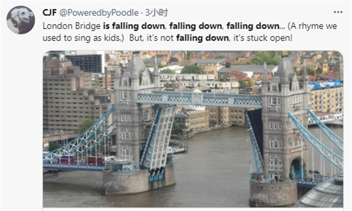 《伦敦大桥垮下来》是英国最流行的一首儿歌,就连很多中国人也会唱这首儿歌,毕竟它已经写进英语课本了。万万没想到,就在近日,伦敦大桥真的“垮”下来了。值得一提的是,这座桥并不是儿歌里的伦敦大桥,而是闻名世界的地标建筑“伦敦塔桥”。根据外媒报道,伦敦塔桥因技术原因被“卡”住了。消息一出,整个英国都在看热闹。