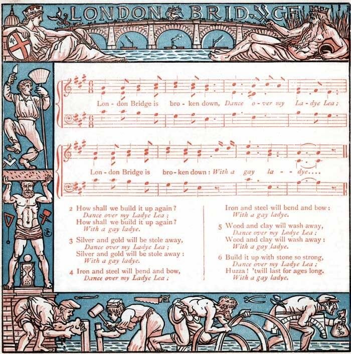 1014年,为了阻拦入侵的丹麦军队,英格兰国王埃塞尔雷德二世主动烧毁伦敦桥。据说,这就是儿歌《伦敦大桥垮下来》的由来。到了1176年,英国人再次重建伦敦大桥,最后于1209年建成。因为这次是用石头建造,所以花费了33年的时间。到了1831年,工程师约翰·雷尼重新设计了伦敦大桥,于是伦敦大桥变成了五拱花岗岩石桥。