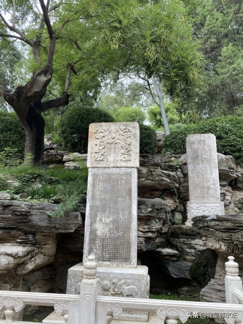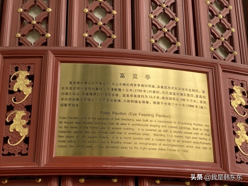 沿山而上,步道旁堆积着太湖石,天然的形状十分奇巧。石板路上有很多圆形的小窟窿,不知道是什么用途。抬头看,台阶之上,一座建筑秀巧的古亭映入眼帘,亭上匾额为“富览亭”。乾隆年间,山前修建了绮望楼,山上修建了五座亭子,亭中都有佛像。中心为万春亭,东侧为观妙亭、周赏亭,西侧为辑芳亭、富览亭。建筑均为皇宫规制,攒[cuan]尖式。光绪二十六年(1900),八国联军劫走四座亭内的铸铜镏[liú ]金佛像,其他各殿陈设宝物也被洗劫一空。