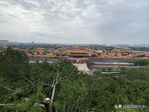 向南看,是故宫博物院,明清两代的皇城——紫禁城,也是世界现存最大、最完整的古代宫殿建筑群。它代表了我国古代宫殿建筑艺术的最高水准。重重殿宇排列有序,琉璃屋顶一片金黄,气势恢宏,巍峨壮丽。