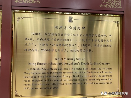 沿路来到景山东麓,崇祯皇帝自缢处。1644年李自成攻破北京城,明朝最后一位皇帝朱由检,跑到景山,在一棵歪脖子古槐上自缢身亡,时年33岁。270多年的大明王朝从此灭亡。