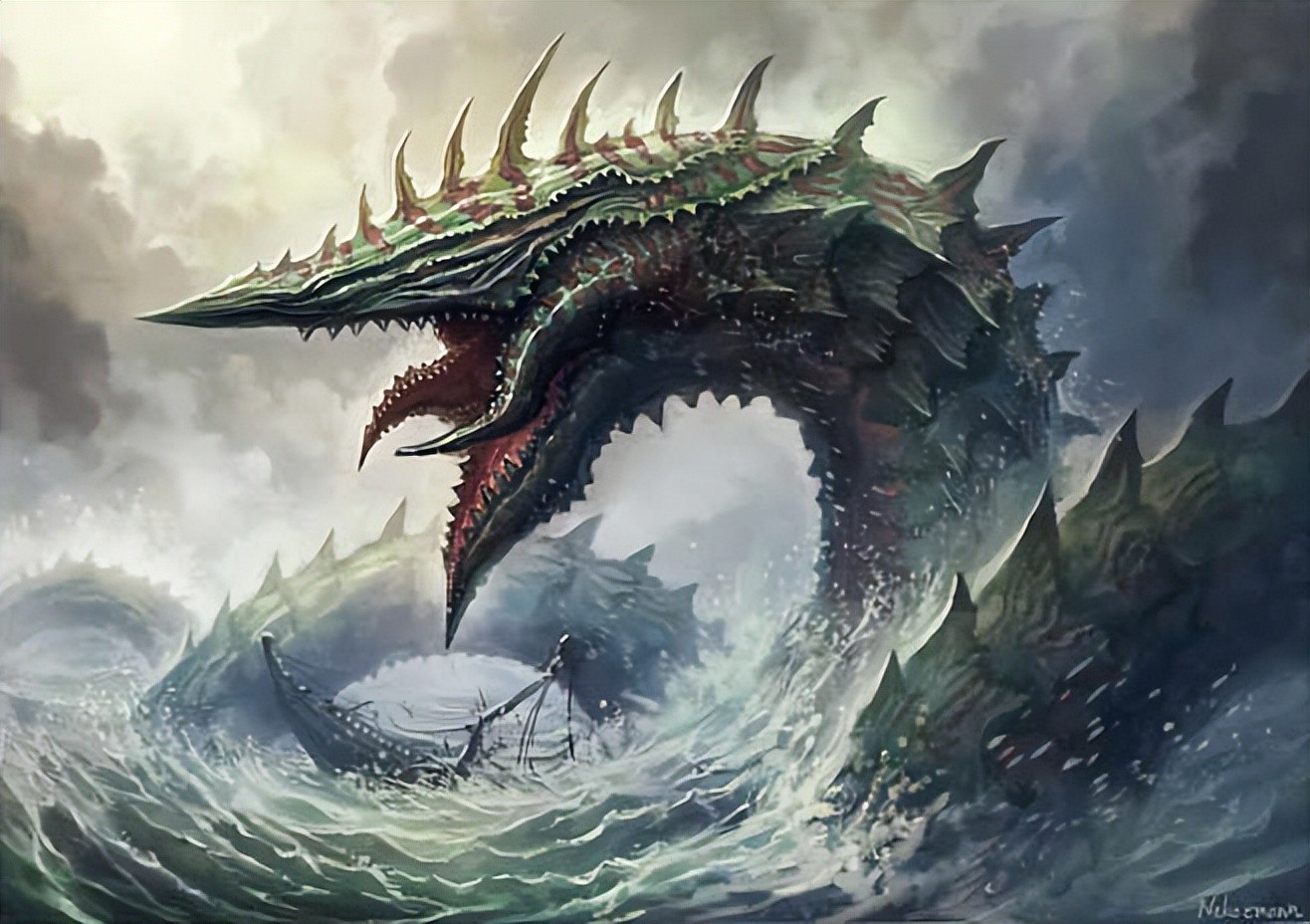 北欧神话中的大海蛇被称为约尔曼加德,也叫“世界蛇”,据说它的体型巨大无比,足以环绕整个世界。有时,它甚至会有许多可怕的触角、翅膀或爪子。在《诗体埃达》中有关于它与雷神索尔的决战描绘。