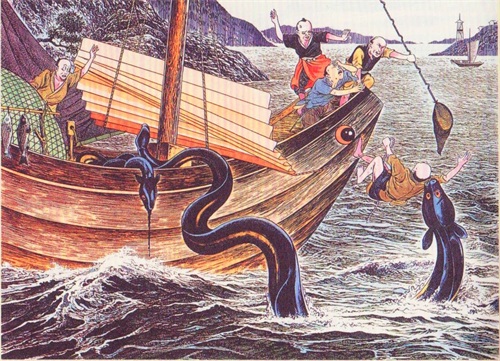 1734年,一位名叫汉斯.艾卡德的船员,当乘坐的船只行驶在挪威和格陵兰之间海域时,发现了一种巨大的蛇形动物在浅海游动,不一会儿迅速游走了。后来人们根据他的描述,所绘制成草图称之为“大海蛇”。
