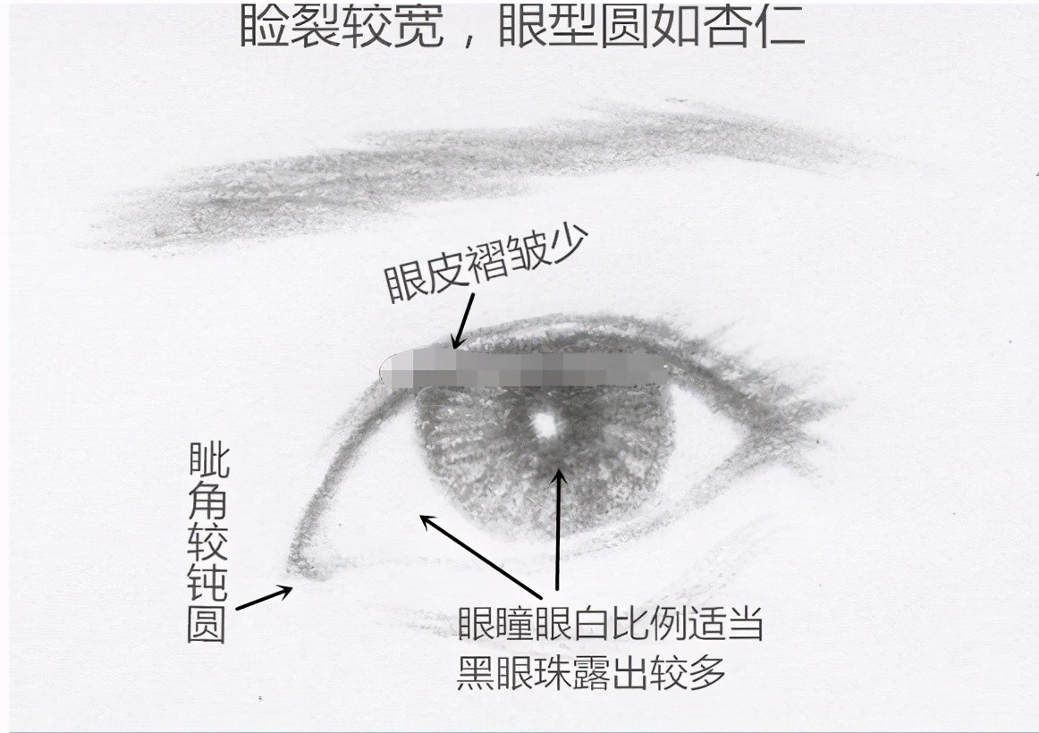 相对于丹凤眼和狐狸眼而言,外眦角较钝圆,也不像桃花眼和丹凤眼的眼尾那么长,眼黑比例占得较多,眼皮褶皱少,杏眼的上眼睑多为小双眼皮或者内双,眼神看起来明亮清澈。