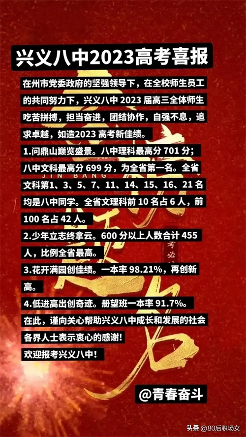拿今年的高考成绩来说,兴义一中这批高考毕业生是当年全州中考前800名以后的学生,但是能拥有今天这样骄人的成绩,老师和学生都付出了巨大的努力,成绩斐然。