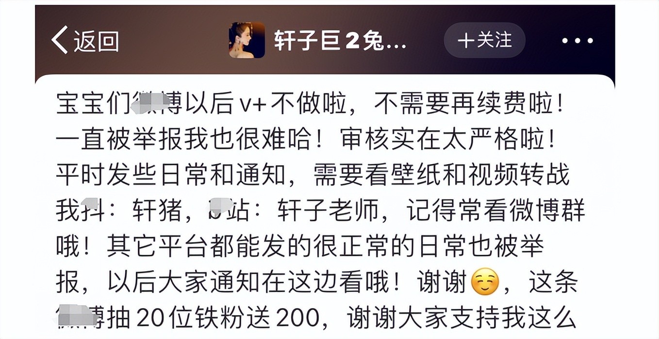 即便如此,轩子巨2兔始终没有忘记对粉丝的承诺。她一直通过短视频和社交平台与粉丝保持互动,并经常发布一些唯美照片,粉丝只要开通V+会员就可以观看特定内容。近日,她宣布将不再运营V+会员服务,并建议粉丝们无需再续费。因为她发现,审核变得异常严格,频繁遭到举报,使得这项服务难以维持。