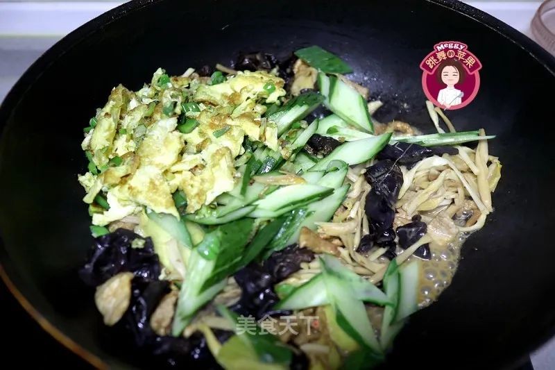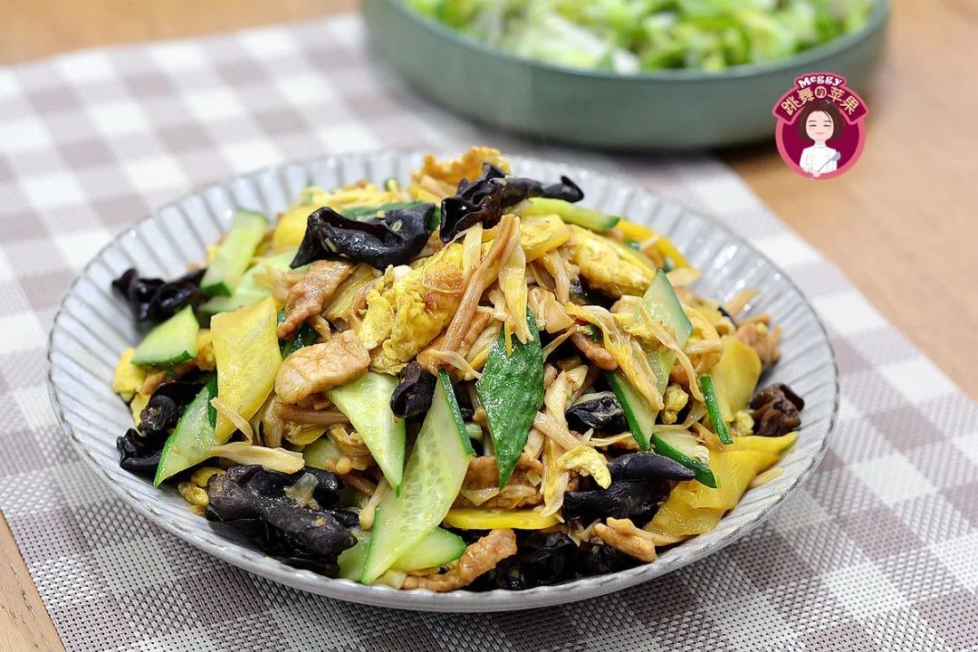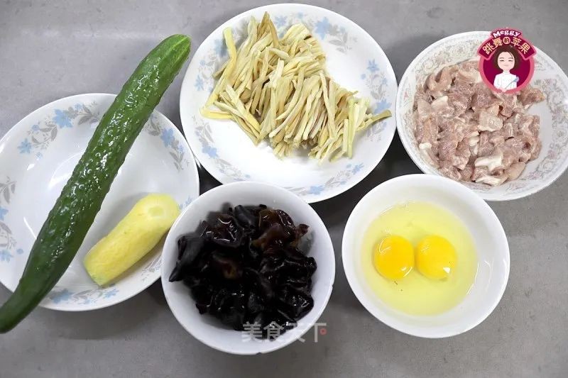 鸡蛋2个猪里脊1块干黄花菜1把黑木耳1把黄瓜1根胡萝卜半根淀粉少许葱花适量姜末少许酱油20克盐适量