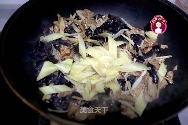 8. 把干黄花菜和黑木耳倒入锅中,这两种干菜比较能吃油,先炒一下可以将肉汁油脂吸收进来。吃起来更香润。