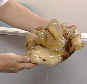 这块物体外边一层如塑料一样坚硬,出于好奇其中一个村民拿着铁锹就想把它剁开,听这个村民说,当时以为它会很硬,所以用了很大力气,没想到只是外皮有些硬,但里面却如同肉一样,这时候一位有见识的村民就说,这应该是太岁吧?