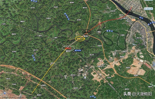空港大道:路线走向图、红色为空港大道简州大桥与成渝高速段。粉色为:成渝高速绛溪河大桥成渝高铁段、黄色段:为成渝高铁机场段。
