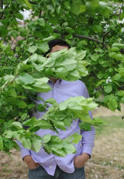 那天食堂出来,我把他领到学校一棵树下。那树上正开着几朵小花,让他站在这个背景下是比较适合的。晓军同学见到花,想掏手机。我说且慢,待我这个专业摄影师干完正经事儿你再下手。他笑眯着进了树丛下,他一得意起来眼睛眯着更小了。坏了,这怎么拍呀,眼睛都找不到了!
