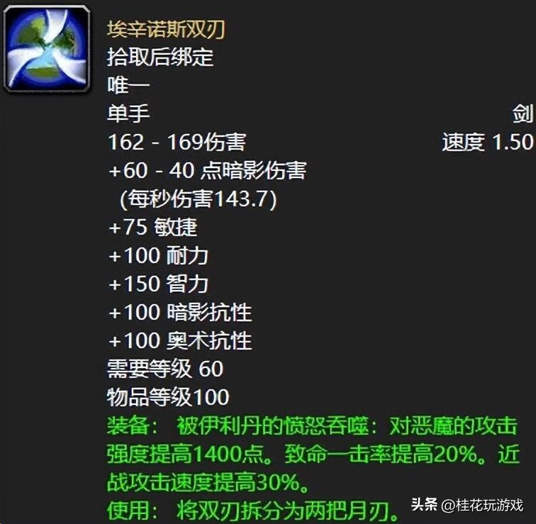 除了以上两件标志性的传说装备,60年代版本中还隐藏着一些数据库中的神级装备。其中最典型的就是埃辛诺斯双刃,这柄标志性的“蛋刀”。数据显示它甚至能够在60级时就佩戴,并且拥有恐怖的0.5攻速加成。真不知道当年的游戏设计师们究竟吸的什么才设计出这种东西。同样我们还需要提到的是,灰烬使者这柄经典的武器,其实数据库中也存在一把同名的橙色传说法杖。这为堕落的灰烬使者未来洗白埋下了伏笔。