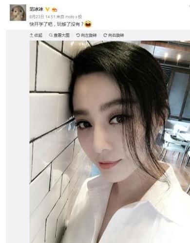 女星范冰冰出道多年,演过许多热门剧。2015年认爱李晨后,频频秀恩爱。昨日,她在微博上晒出一张自拍照,却无故被网友催婚。范冰冰在23日在微博上晒出性感自拍照,写到:“快开学了吧,玩够了没?”图中的她身穿白色V领衬衫,大眼依旧动人,皮肤白皙。