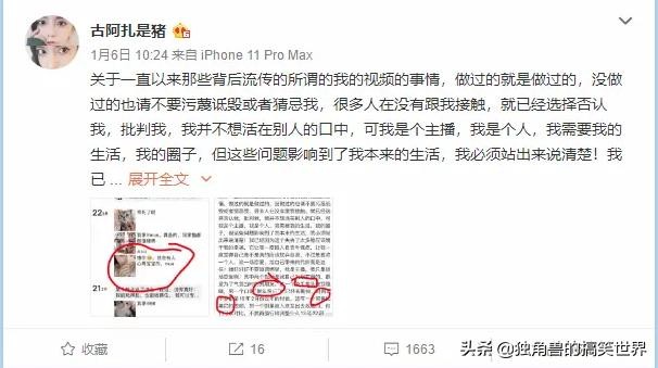 原来在上次火了以后,有人就在网上爆出了大量不雅视频,数量一度被传为有三十多部,古阿扎和大多数小有名气的主播一样陷入了“视频门”,这次事件让古阿扎瞬间出名,经过这次视频门事件名声大噪,但是有很多都是负面的骂声,吸引了无数男网友们的冷嘲热讽,严重的影响到了古阿扎的私人生活。用她的话说她甚至一度不敢出门,感觉所有人都在嘲笑她,让她十分崩溃的是自己明明是受害者却背负着这么多的骂名。